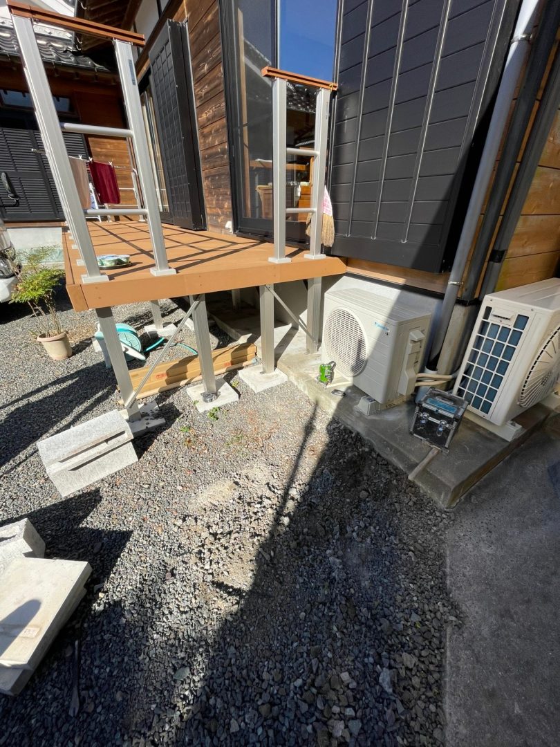 ウッドデッキへの昇り降りをより安全で快適にするため、モルタル階段と手すりの設置工事を行いました。
